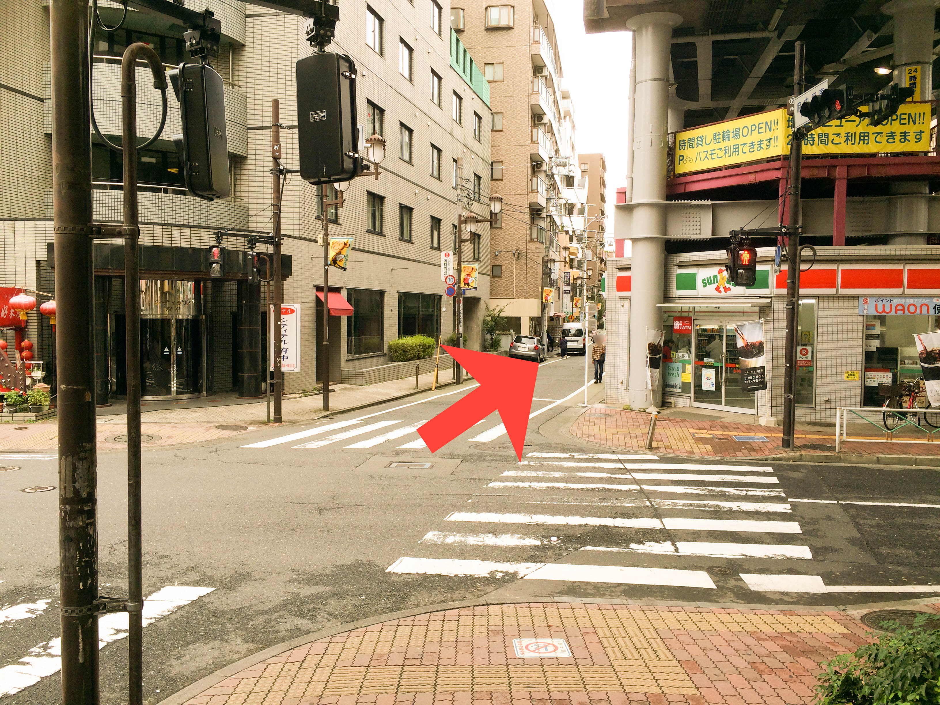 線路下駐輪場とシティテル(ビジネスホテル)の間を進みます。